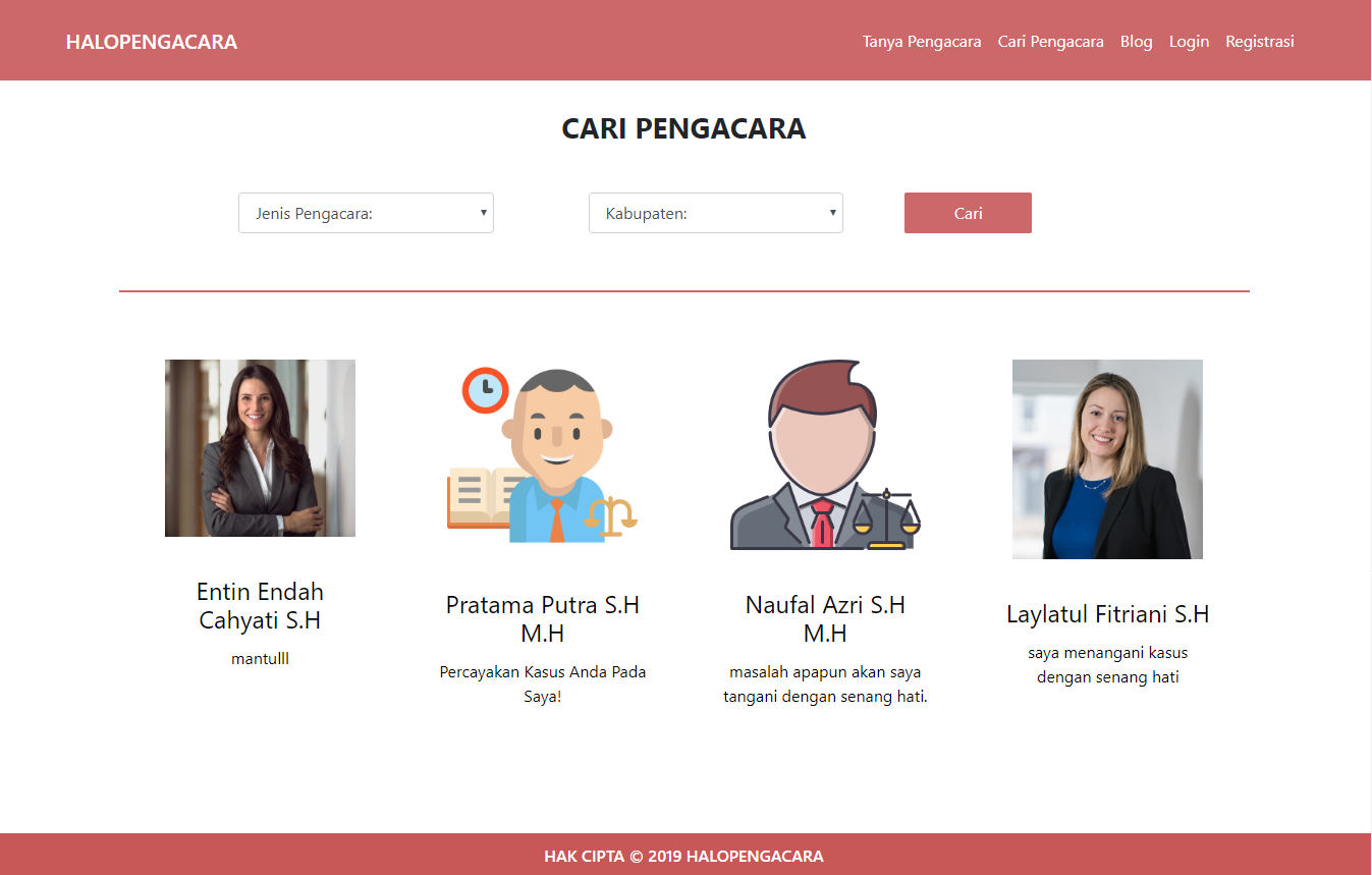 HALOPENGACARA is a web-based system to make it easier for clients to find lawyers who suit their case. The features is: