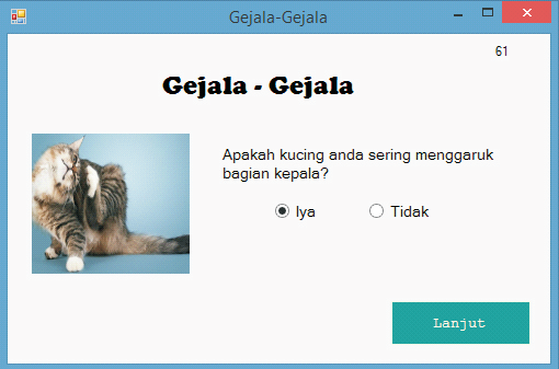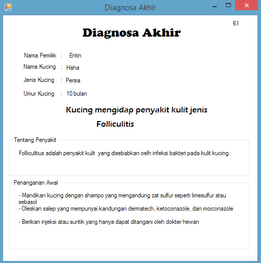 System of cat skin disease is a desktop application used to detect skin diseases that occur in user's cat. This application can display the types of diseases that attack cats, description of the disease, and how to initially treat the disease that is suffered.